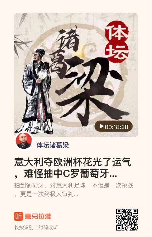 由《体坛周报》与喜马拉雅FM联合推出的播客节目——《体坛诸葛梁丨梁熙明电台》正式上线。 抽到葡萄牙,对意大利足球,不但是一次挑战,更是一次终极大审判。 点击下方链接,或扫描二维码,即可进入“体坛诸葛梁”收听节目,与梁熙明就足坛热点展开交流。 意大利夺欧洲杯花光了运气,难怪抽中C罗葡萄牙...